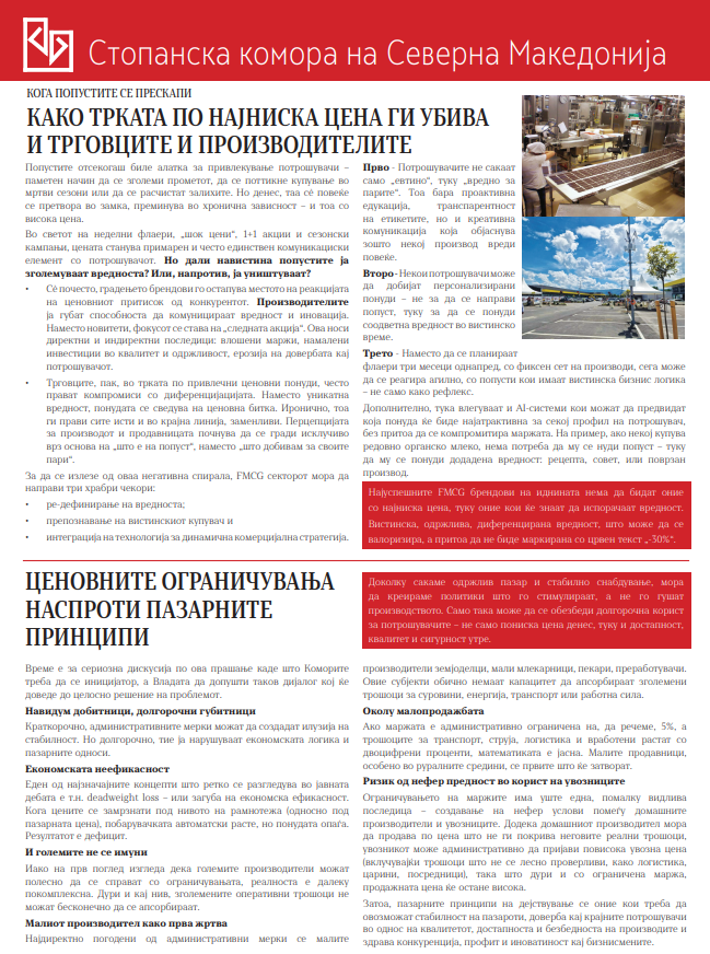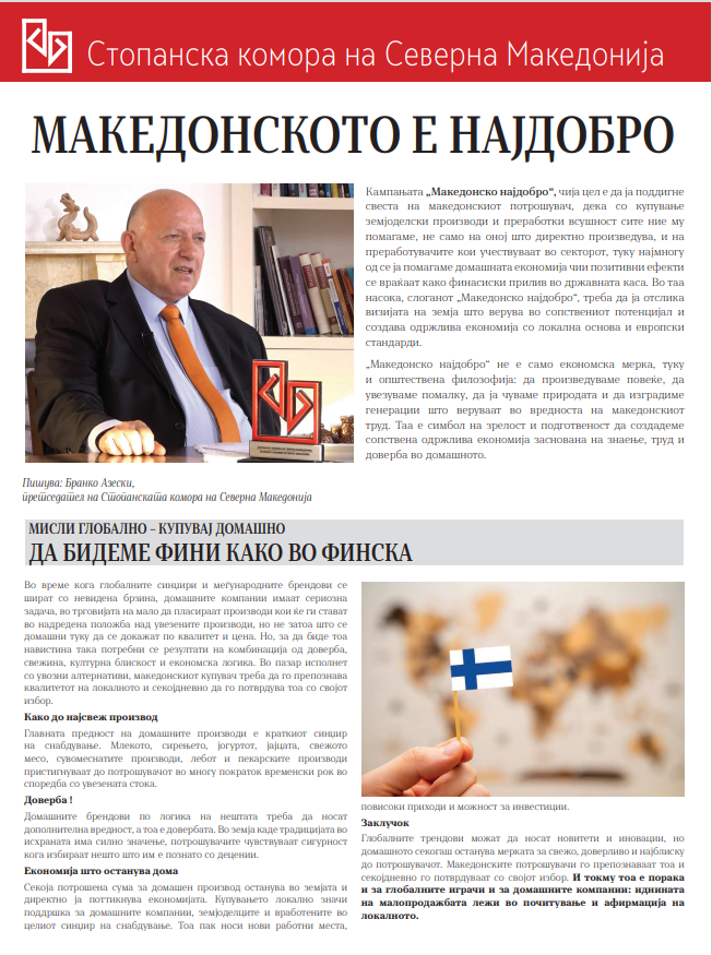 The Economic Chamber has released a flyer titled “Macedonian Is the Best”, presenting views expressed by its President, Branko Azeski. The aim of the flyer is to raise awareness among Macedonian consumers that by purchasing domestic agricultural products and processed goods, we are helping not only those who directly produce them and the processors involved in the sector, but above all the domestic economy, whose positive effects return as financial inflows into the state budget.