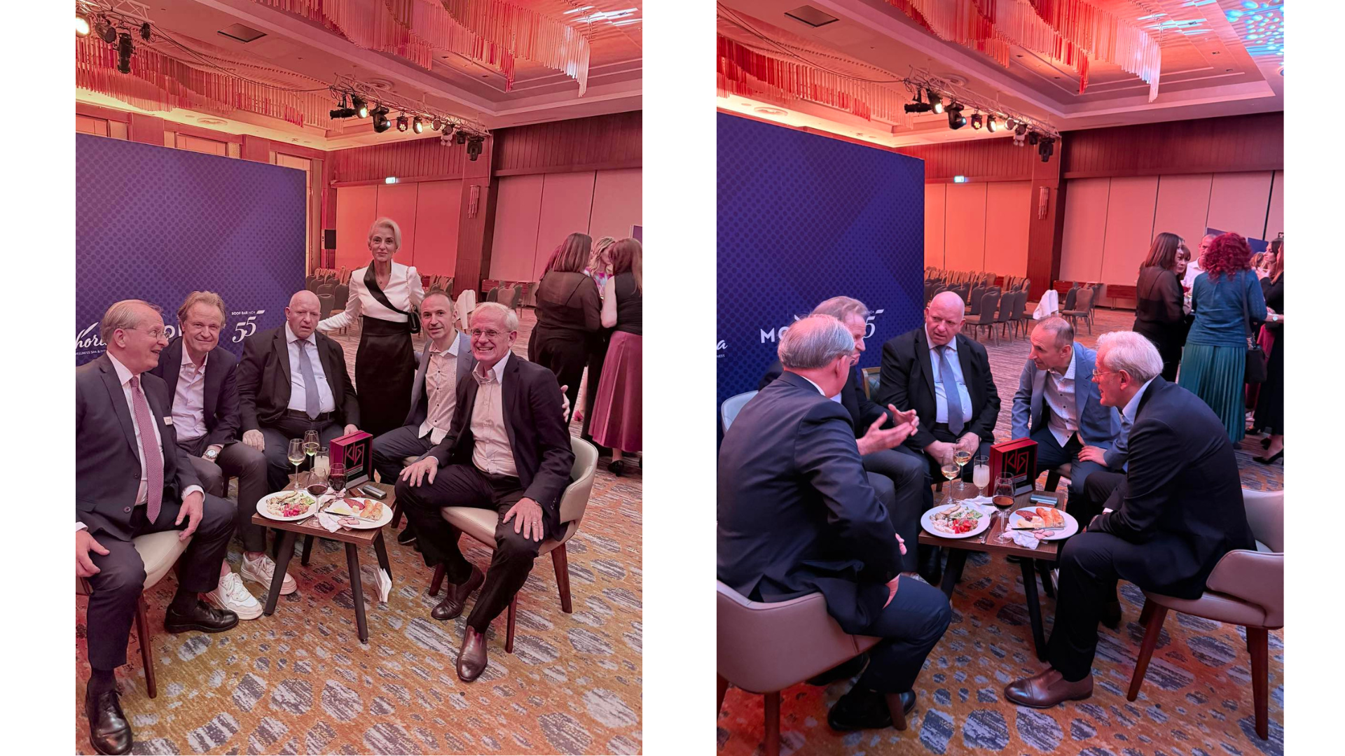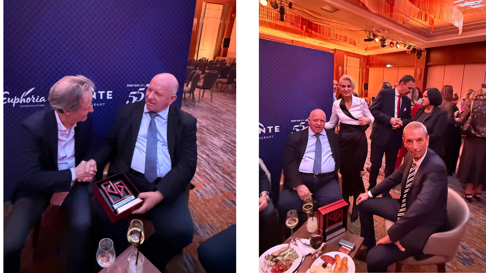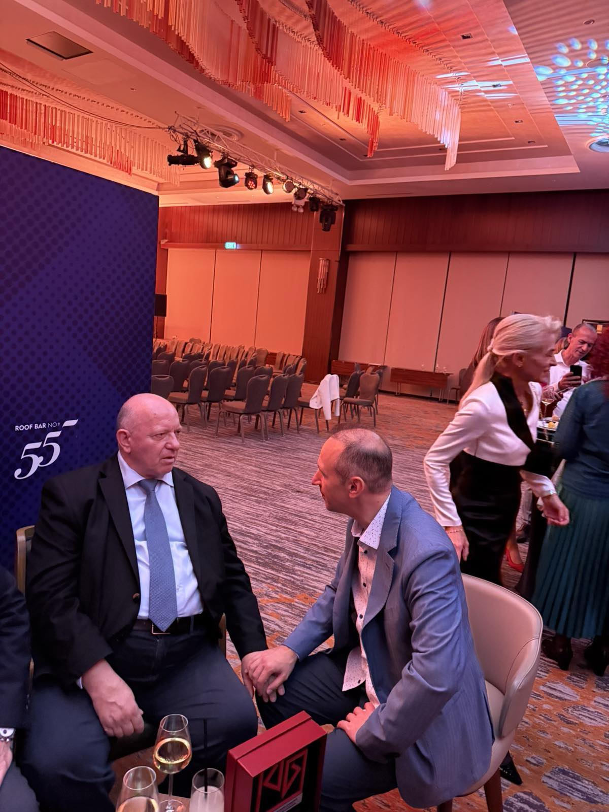 На сликата со претседателот на Стопанската комора на Северна Македонија Бранко Азески се (од лево кон десно) проф. Петар Сеферовиќ, проф.д-р Томас Лушер еден од програмските директори на Школата, кој е претседател на Европското здружение по кардиологија, директор за истражување, едукација и развој и консултант кардиолог во Кралскиот болнички фонд Бромптон и Харфилд и професор по кардиологија на Империјал колеџот во Лондон, д-р Тања Анѓушева од Клиниката Жан Митрев и вонреден професор на Медицински факултет Универзитетот Гоце Делчев, маестро Симон Трпчевски и проф.Франческо Консетино